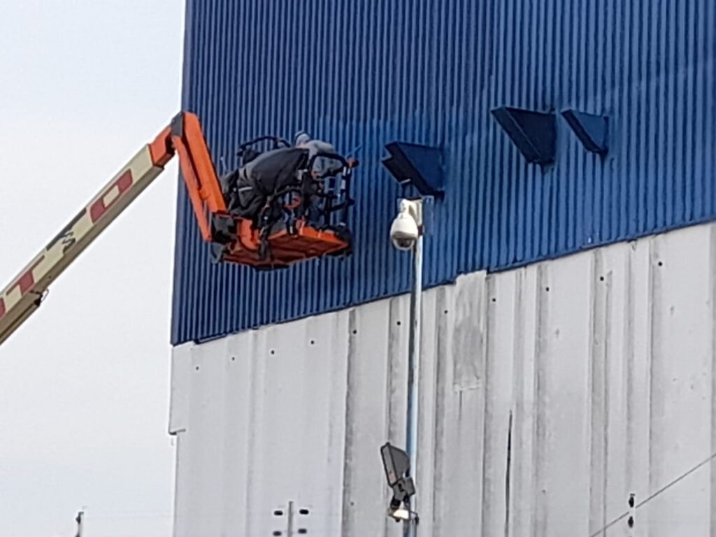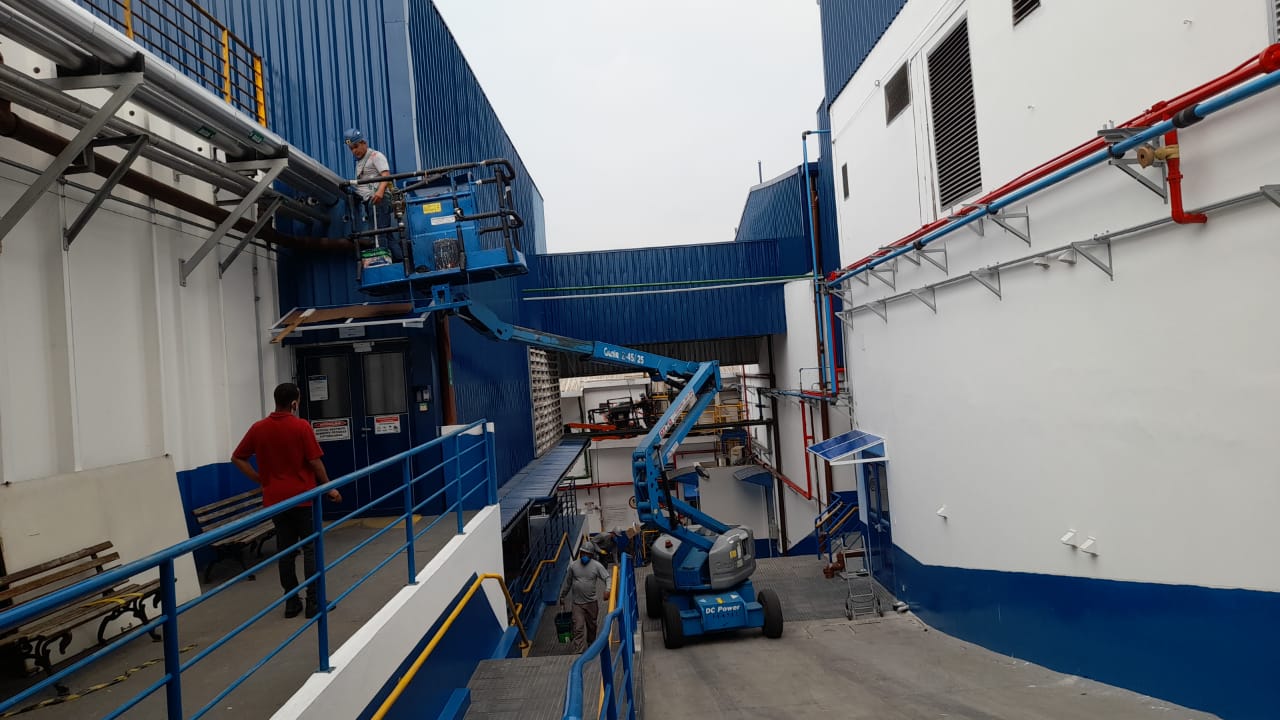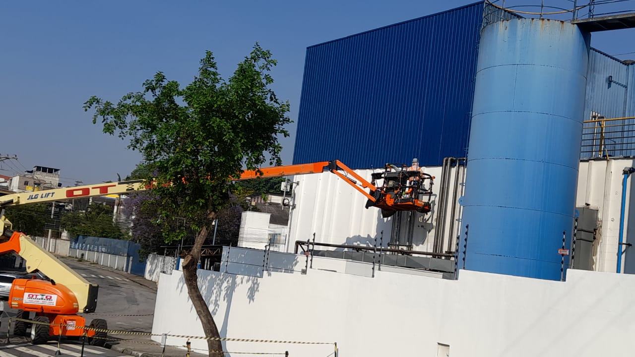 Pintura de fachada da Indústria farmacêutica Amgen Bergamo em Taboão da Serra. Limpeza, restauração e pintura de fachada.
